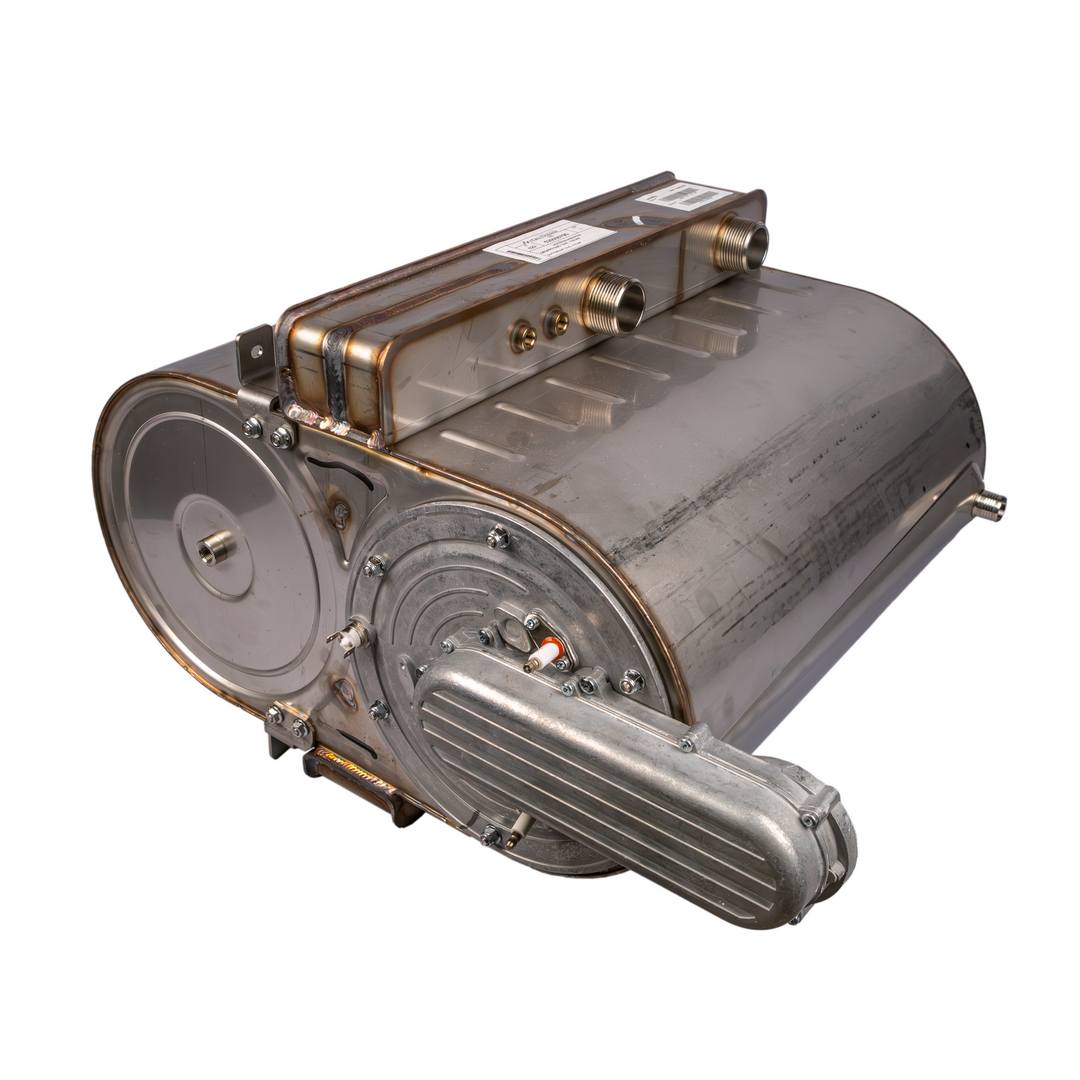 Передает тепловую энергию сжигаемой в камере сгорания газовоздушной смеси теплоносителю посредством теплопроводности. Альтернативное название - монотермический теплообменник.